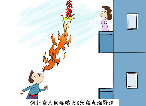 新闻浮世绘:河北奇人用嘴喷火6米高点燃鞭炮