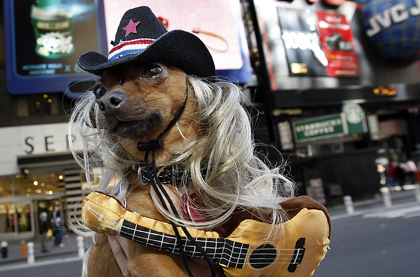 图片四:没听说过“赤裸牛仔”么?那你可要落伍了!“赤裸牛仔”可是时代广场最有名的人物之一。这不,连这个吉娃娃都是他的忠实粉丝,打扮成他最红火时流浪歌手的模样。(钟岩)