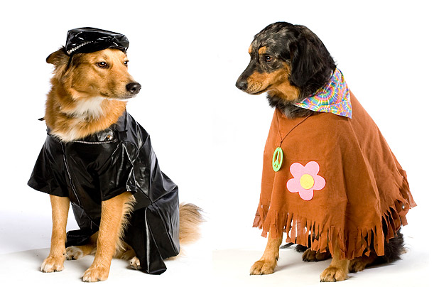 图片五:在左边图片中,小母狗苏菲穿上雨衣皮装,欲表现嬉皮士的不羁风格;右边图片中,小公狗丹特却披上围巾,装出一副温顺休闲的模样。(钟岩)