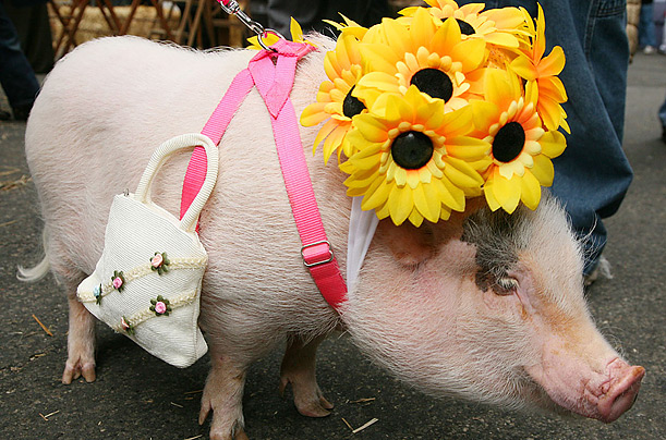 图片六:在纽约城举办的第三十三届麦茜画展上,“猪小姐”头戴鲜花,身背女士小坤包闪亮登场,吸引了众多的目光。(钟岩)
