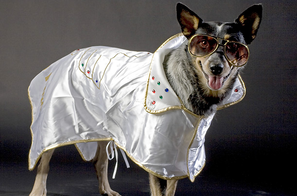 图片九:身着华丽的白色演出服,戴着酷酷的遮住半个脸的大墨镜,你想起谁了?“猫王”?没错,图片中,这只猎犬便被他的主人打扮成了这幅模样,它的主人一定是猫王的追随者。(钟岩)