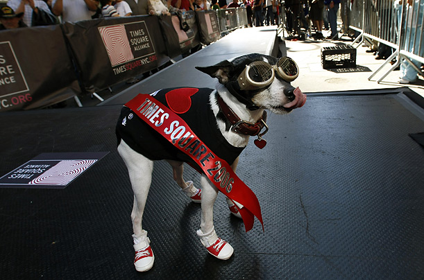 图片十六:在十月二十一日时代广场举办的群狗化妆晚会大赛开始之前,2006年大赛的冠军派普正走上比赛舞台,与大家打招呼。(钟岩)