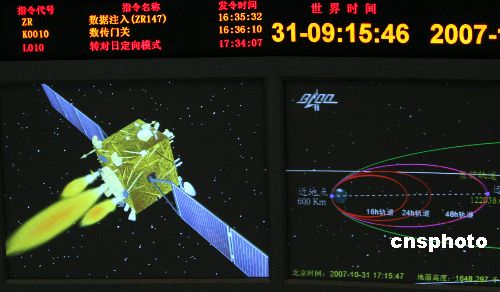 北京时间十月三十一日十七时十五分,北京航天飞行控制中心成功对“嫦娥一号”卫星实施第三次近地点变轨,卫星顺利进入地月转移轨道,由此真正开始了她的奔月之旅。“嫦娥一号”卫星发动机开始工作七百八十四秒后,正常关机。北京航天飞行控制中心对各项测量数据的计算表明,卫星变轨成功,由绕地飞行轨道进入地月转移轨道。中新社发 孙自法 摄