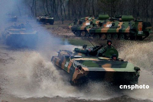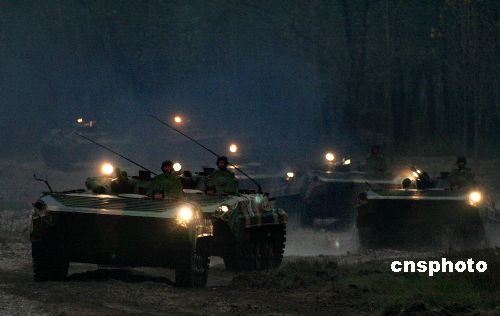 10月底,“铁拳-2007”复杂电磁环境下机步师实兵检验性演习完成电磁对抗,进入实兵交战阶段。图为装甲部队向演习地域集结。中新社发 曾宪平 摄