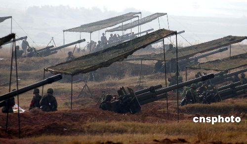 炮兵群迅速开设阵地对“蓝军”实施火力压制。
