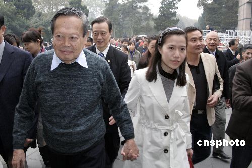 11月12日,著名物理学家、诺贝尔奖得主杨振宁携夫人翁帆回到故乡安徽合肥,准备参加首届侨界精英安徽发展论坛大会。中新社发 张娅子 摄