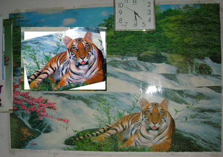 前晚9时,网友“攀枝花xydz”在“打虎派”大本营色影无忌华南虎临时论坛发帖说,“周老虎”的原形是一副老虎年画,除耳朵不一样外,哪里都一样,甚至连老虎纹路都是一样。各路高手将年画老虎与“周老虎”进行比对,得出是同一只老虎的结论。