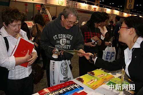 开幕当天,驻足汉办展区参观咨询汉语教材者络绎不绝。中新社记者 吕振亚 摄