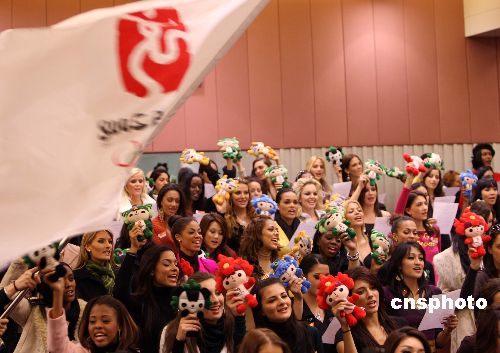 十一月十九日,来自世界一百多个国家和地区的一百零六名世界小姐在北京举行奥运歌曲《点燃激情 传递梦想》英文版录制活动。这首北京奥运圣火歌曲将在奥运历史上成为演员国别和地区最多的一首歌。一百零六名世界佳丽现场演唱北京奥运歌曲。中新社发 任海霞 摄