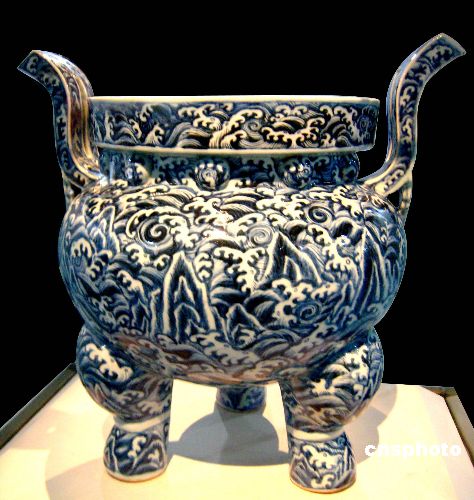 明代宣德御窑瓷器的巅峰之作--青花寿山福海纹瓷炉。
