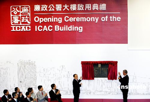香港廉政公署新大楼十二月八日揭幕,中国最高人民检察院检察长贾春旺和行政长官曾荫权出席开幕典礼。曾荫权在开幕礼时表示,廉署成立30多年来,都致力维持本港重要核心价值,对贪污作出“零”容忍。他相信,廉署人员会继续无畏和不偏不依,为香港服务。曾荫权与廉署专员汤显明主持揭幕礼。 中新社发 王丽南 摄