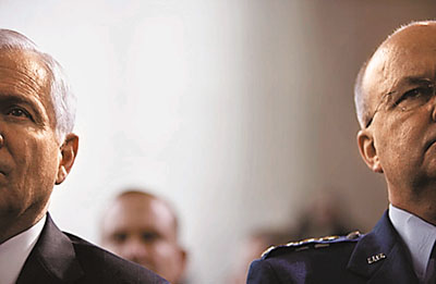 美国国防部长盖茨(左)与国家情报局长海登的宣誓仪式。
