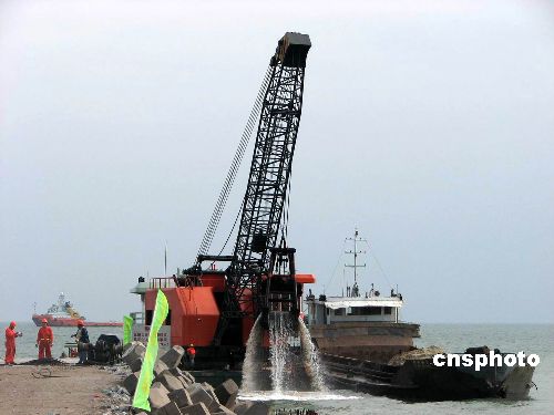 12月24日上午10时,“南海一号”靠近码头,直至当日下午4时没有前进,登陆时间不能确定,挖沙船正在岸边清理航道。中新社发 索有为 摄