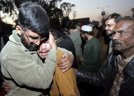 中新网12月27日电 据法新社报道,巴基斯坦前总理贝-布托今日在竞选集会上遭到炸弹袭击,不治身亡。图为贝-布托支持者悲痛欲绝。(关新)