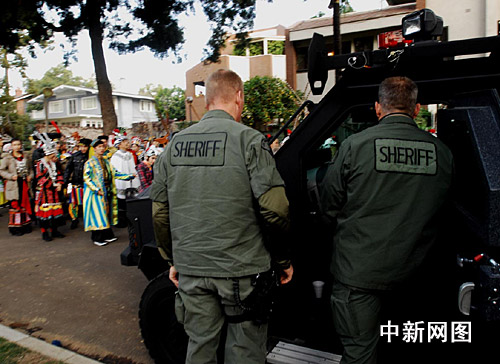 美国警方特种部队重点对花车和游行队伍高度保护。
