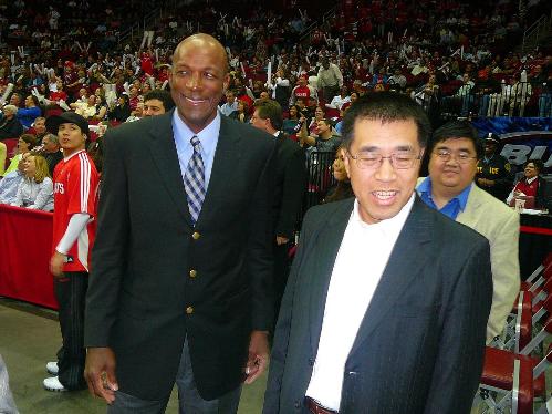 火箭队“滑翔机”得雷克斯勒(右)见到老朋友王宁后特别高兴。美国《明桥体育》供图 / 许阳 言心 摄影