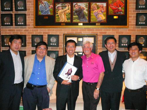 王宁部长(左3)在《明桥体育》负责人和当地著名华人企业家郭翔的陪同下,拜访六十年代国际著名的高尔夫球星道格-桑德斯(右3),并邀请他到中国去访问。美国《明桥体育》供图 / 许阳 言心 摄影