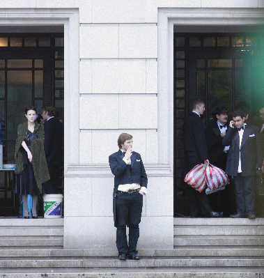 由于音乐厅四个门口都有剧组的工作人员严格控制进出人员,而导演陈凯歌,主演黎明、孙红雷又都是经过地下停车场直接进入音乐厅内部,所以早报记者只是从工作人员处获悉,当外籍演员都在两侧边门抽烟聊天时,黎明正在音乐厅内上妆。据消息人士透露,为了昨日这场戏,黎明早在北京拍摄时就开始准备,而且为了符合梅兰芳去百老汇时的体态,黎明还特意增肥,使脸庞看起来圆润一些,更貌似梅兰芳。 记者 刘嘉琦