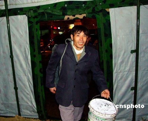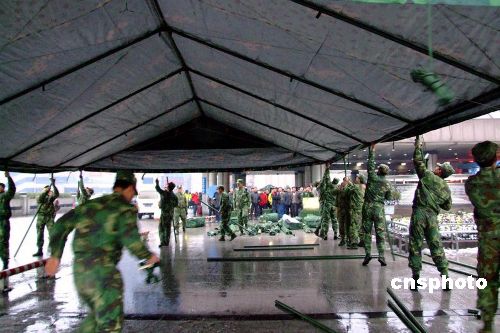1月27日,南京军区“硬骨头六连”所在师接到杭州市政府请求支援电话,派出200余名工兵,火速赶往杭州火车站。官兵们寒着风雪严寒,很快搭设好12顶野战帐篷,并在帐篷里铺设了草垫子,为滞留旅客提供休息之地。滞留在车站的民工旅客走进野战帐篷,脸上露出笑容,高兴地说:今晚不会挨冻了,感谢党和人民解放军。据车站负责人介绍,因冰雪天气影响,这天约有2万名旅客滞留杭州火车站。中新社发 邱柏星 摄