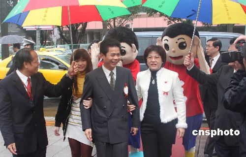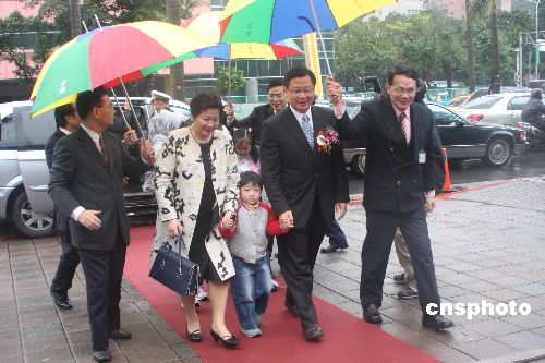 国民党籍“立委”江连福带着两位喜气洋洋的“福”字大头娃娃前来报到,引来一片笑声。