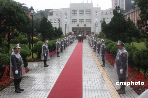 清晨,台湾“立法院”的工作人员冒雨从大门口开始铺设通到“议场”的、长达百米的红地毯。