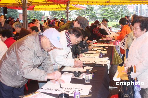 台湾一年一度的新年开笔大会,2月3日在台湾领导人办公室前广场举行。报名参加书法挥毫者达三千多人。中新社发 耿军 摄
