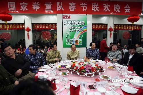 2月6日,农历除夕,中国国家体育总局训练局运动员餐厅热闹非凡,国家体育总局局长刘鹏,举摔柔中心主任马文广和国家举重队队员一起欢度除夕之夜。中新社发 杜洋 摄