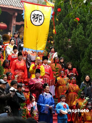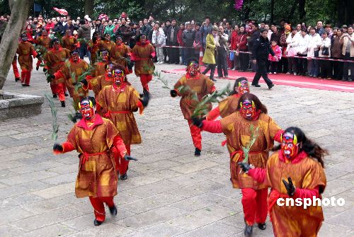 2月7日,农历鼠年大年初一,广西柳州举办雷塘庙会,近百人组成的祭天祈福队伍在雷塘庙前宣读祭文、跳傩面舞、祭拜雷神,再现一千多年前在柳州执政的唐代政治家、文学家柳宗元祭天祈福、为民祈雨的场景。中新社发 蒙鸣明 摄