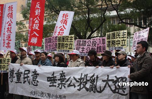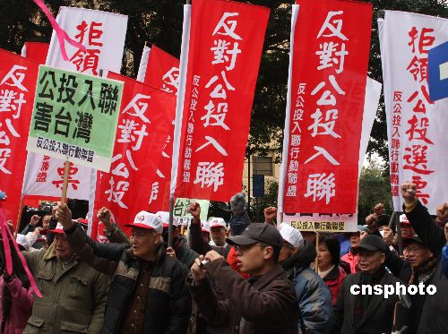 台湾“中央选举委员会”将从2月27日起主办十场“入联公投”、“返联公投”意见发表会或辩论会,14日是反方代表申请期限。台湾劳动党主席吴荣元、民主行动联盟总召集人黄光国到“中选会”递交公投反方代表申请书,他们还率领“反公投入联行动联盟”成员在“中选会”前表达诉求,群众高举“反对公投入联,拒领公投票”等标语,主张拒领公投票,要求中国国民党与民主进步党抛弃“公投入联”、“公投返联”议题。中新社发 耿军 摄