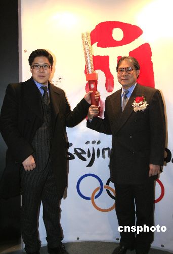 香港体协暨奥林匹克委员会会长霍震霆携长子霍启刚在北京奥运会火炬展品前留影。
