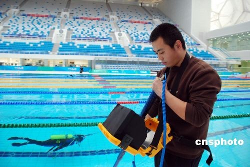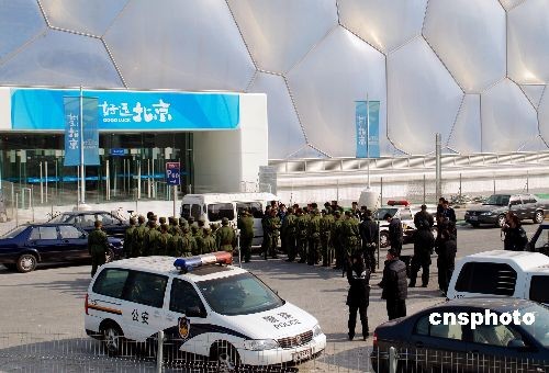 2月15日,北京奥运安保指挥中心防爆安检部,组织公安民警和解放军官兵对北京奥运场馆“水立方”进行地毯式安全检查,以确保19日开幕的第16届世界杯跳水公开赛。中新社发 杨慧峰 摄