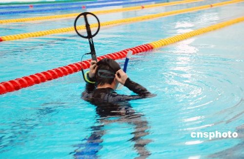 一名警察在对北京奥运场馆“水立方”水底设施实施防爆安全检查。