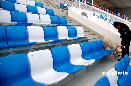 警察带警犬检查北京奥运场馆“水立方”座椅设施。