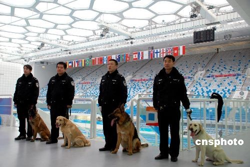 北京朝阳公安警犬队民警准备对奥运场馆“水立方”实施无遗漏防爆安全检查。