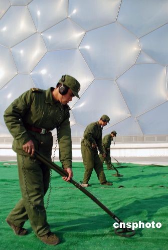 解放军工兵正对北京奥运场馆“水立方”外围实施防爆安全检查。