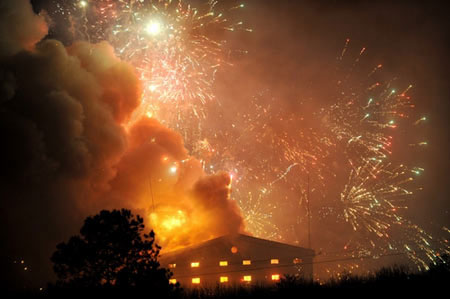 存放烟花炮竹的仓库发生爆炸,烟花四射。图据香港文汇报