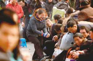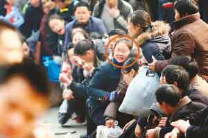 回到队伍末端,瘦小男子只得重新排队。他一脸无辜的自称涪陵区人,名叫孙文件,在天津打工,从13日便开始候票。孙先生告诉记者,排在队伍前面的一半左右的人都是票贩子。他说,之所以这么肯定这些插队的人是票贩子,是因为他认得其中一个,那个人13日下午向他兜售过到北京的硬坐车票,加价250元,他没敢要。