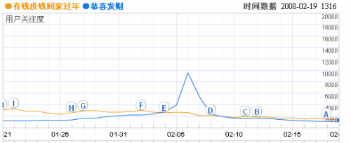 除此之外,由于情人节正好是正月初八,很多恋人面临无法约会的情况。所以网民对情人节短信和情人节情歌的关注远远超过了其他内容。报告指出,在情人节歌曲中,孟庭苇的老歌《没有情人的情人节》依然受到青睐,情人节当天有50万人检索。
