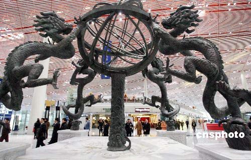 中国雕龙浑天仪落户北京首都机场3号航站楼。
