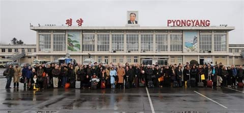 美国纽约爱乐乐团成员抵达朝鲜首都平壤后合影。