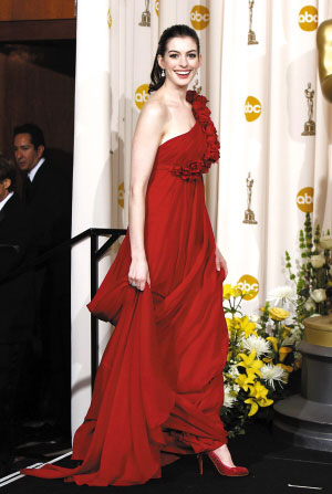 安妮·海瑟威 最典雅的红色穿法。海瑟威一袭Marchesa礼裙让人惊艳,从肩部到腰处斜斜地点缀着一道花束带,加上裙摆上的皱褶,看上去如古希腊雕像般典雅美艳。