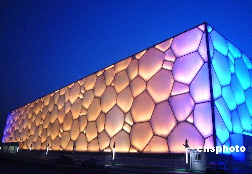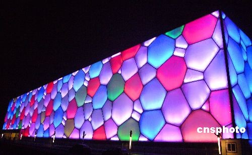 3月4日晚,北京国家游泳中心(“水立方”)在蓝色主灯光的照射下晶莹剔透,其间闪烁变幻的红、黄、橙、绿等灯光组合更是鲜艳夺目,呈现出色彩斑斓如诗如画的梦幻佳境。中新社发 玉龙 摄