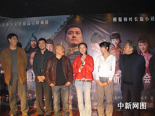三月十四日,由西部电影集团投资的电视连续剧《关中风云》在西安举行新闻发布会。图为剧中的男一号李亚鹏以及导演丁黑等来到现场,气氛热烈。作 者:冽玮