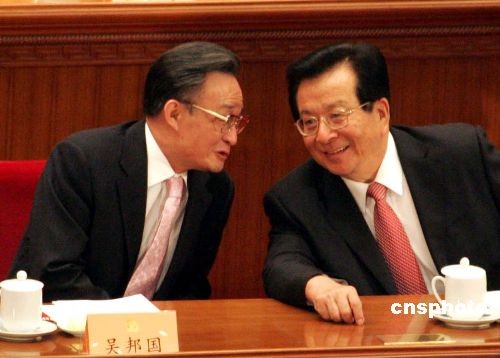 图:吴邦国、曾庆红全国政协闭幕会上交谈
