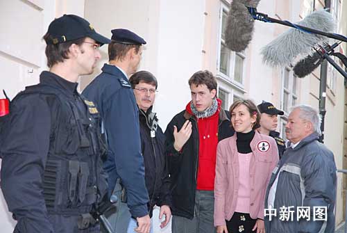 “对基地说不”组织负责人马伊切克(右4) 向美国大使馆交涉,声称要向美国政府送交伊朗战争物证。