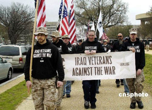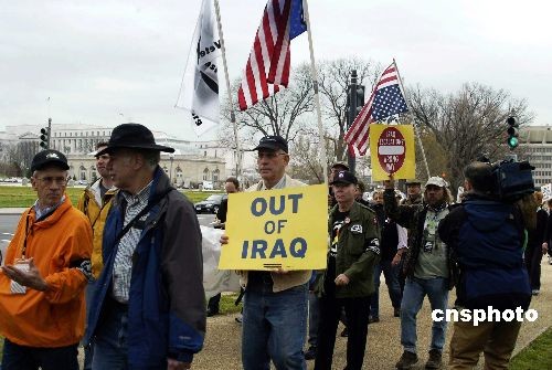 3月19日,在伊拉克战争爆发五周年的日子里,美国华盛顿国会山前聚集了大批反战示威人群。一些示威者呼喊反战口号,呼吁美军“撤出伊拉克”。中新社发 邱江波 摄