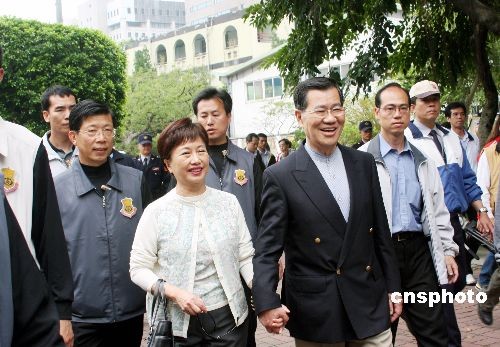 萧万长与夫人在台北一个投票所投票后,在警力的保护下离开。