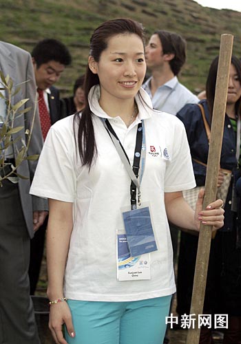 北京奥运会火炬希腊传递的第一位中国火炬手、雅典奥运会游泳冠军罗雪娟,3月23日在希腊古奥林匹亚遗址顾拜旦纪念碑后的世界和平林种下橄榄树苗,以帮助恢复古奥林匹亚遗址周围2007年夏天遭受大火严重破坏的自然环境。中新社记者 王欢