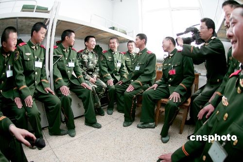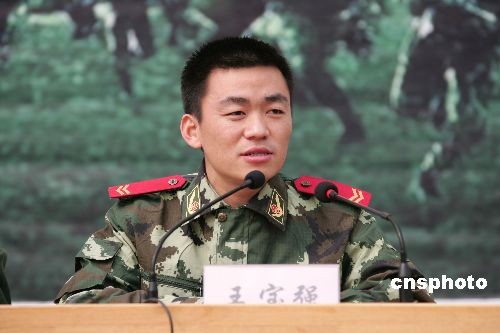 3月21日,《士兵突击》中扮演许三多的新星王宝强,应邀来到武警河北总队邢台市支队新训大队,与新兵面对面交谈,共话军旅人生。中新社发 余洪恩 摄