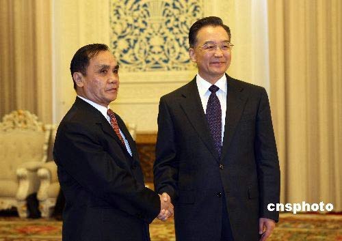 3月24日,中国国务院总理温家宝在北京人民大会堂会见老挝国会主席通辛·坦马冯。中新社发 盛佳鹏 摄